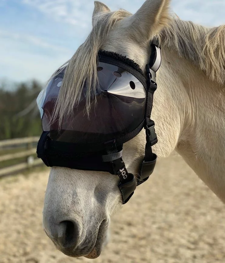 Beskrivelse EQUIVIZOR-skjermen er beregnet på hester som lider av en øyesykdom, som har vært igjennom øyekirurgi eller som ofte klør i øynene. Skjermen er laget av myk og farget PVC. Dette gir en ekstra beskyttelse mot sollys. Det følger også med et UV-motstandsdyktig fluenett for ekstra beskyttelse i tillegg. Send oss gjerne en mail hvis du har spørsmål ang skjermen eller for mer info. Post@dyreskjermer.no |